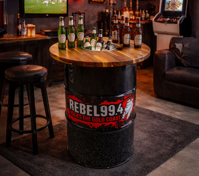 Not your average bar table - Barrel Monkey brings industrial grit with a cheeky twist. Tough as steel, made for mischief, and ready for any round.